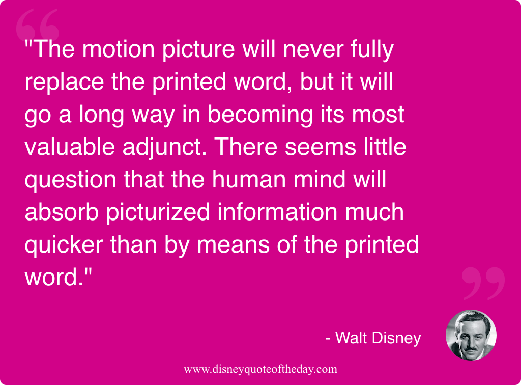 The motion picture will never fully replace the printed word, but it will go a long way in becoming its most valuable adjunct. There seems little question that the human mind will absorb picturized information much quicker than by means of the printed word.